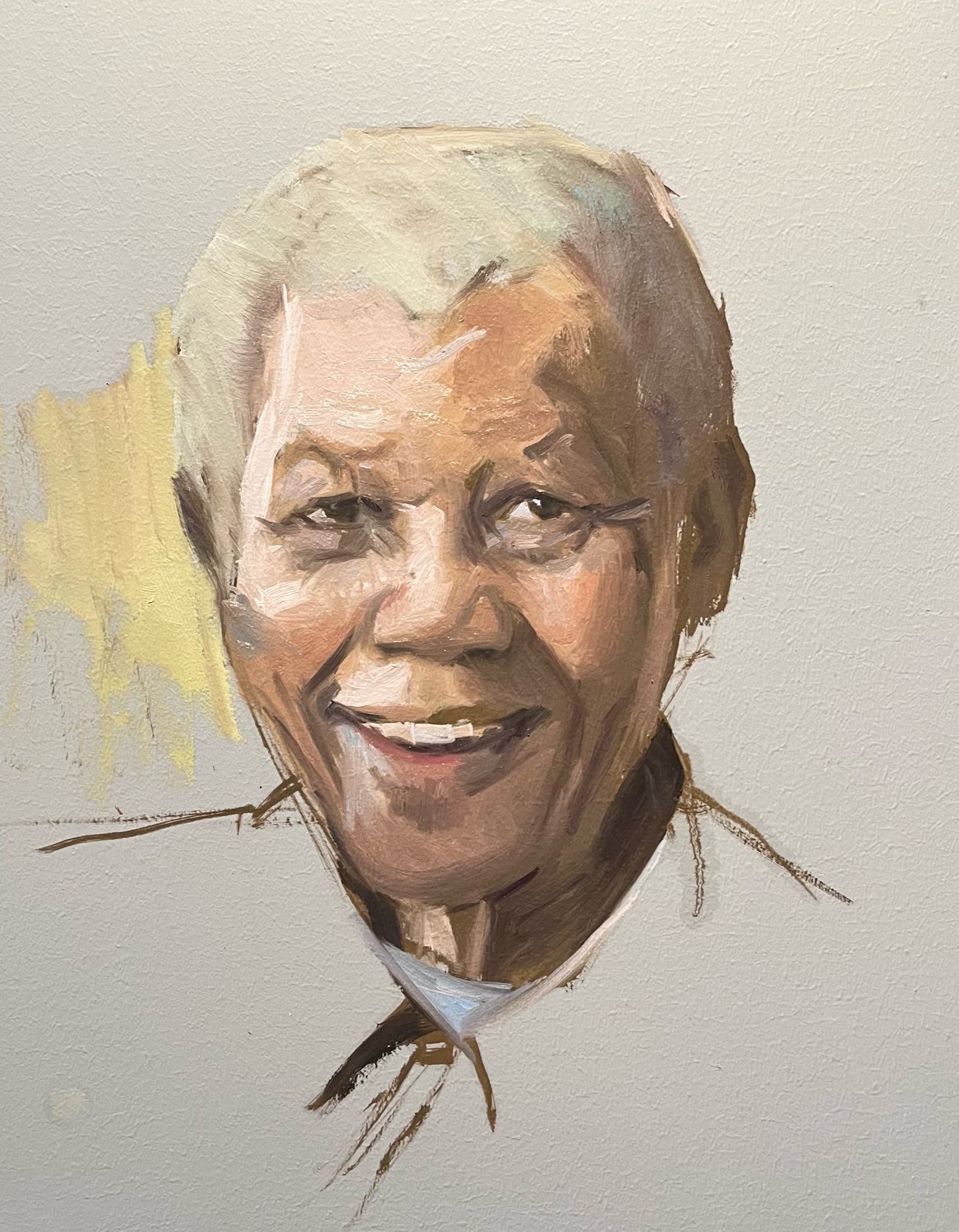 This week we painted Nelson Mandela. After mixing your average colors, use the notanizer image to block in your colors. The notanizer image flattens and simplifies the head. Once the block in is done then you can go in and add the variations and work with edges to make the form 3d.