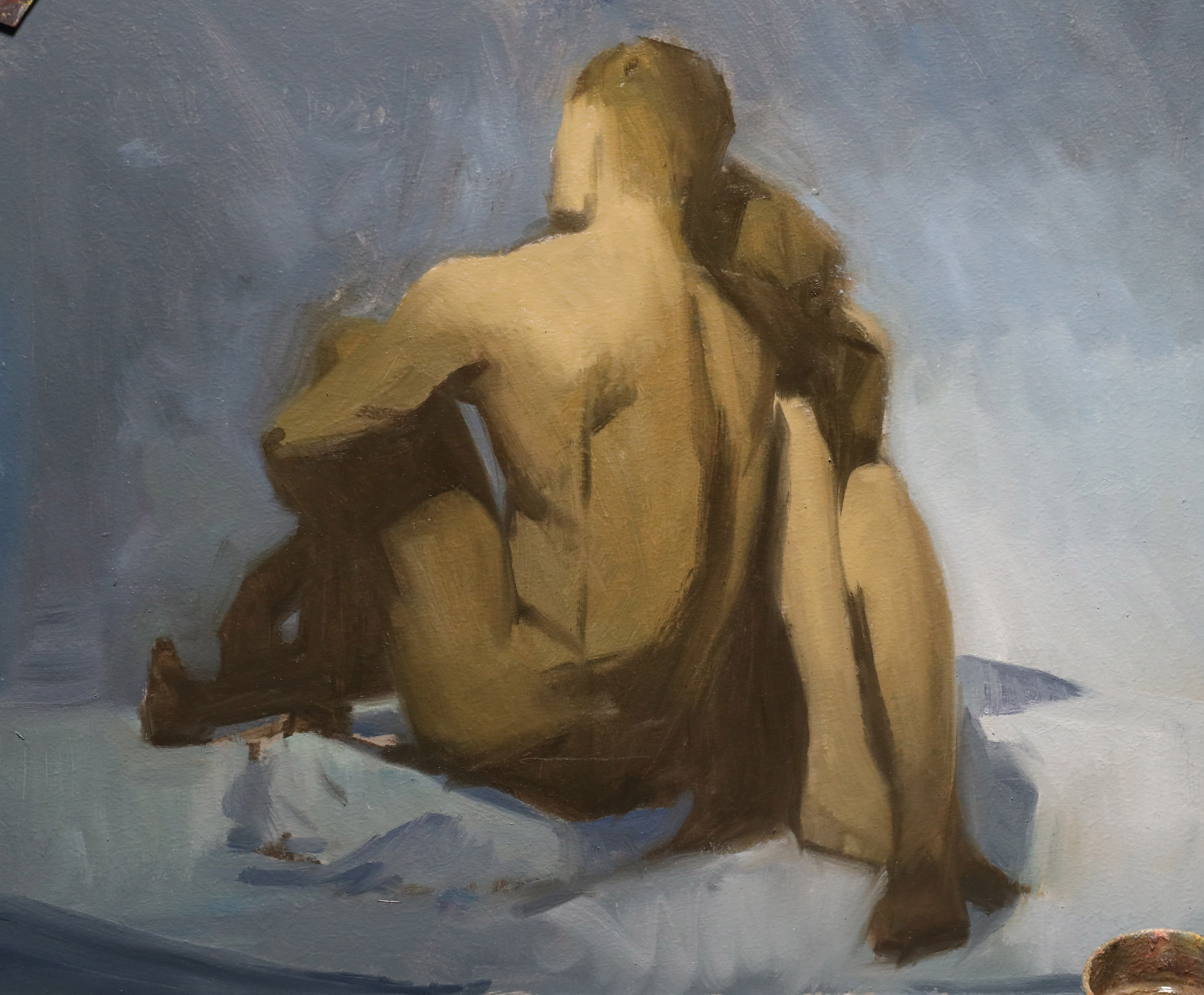 First thing is to mix up the average colors for the Dark, mid and light areas of the figure and background. Then using the posterized image (notanizer app image) as a guide block in the shadow shapes first. then mid-tone shapes and finally the light shapes. Don't go into detail but try to refine the shapes as much as possible. Remember that next week we will do all of the color variations, edge/blending work and detail