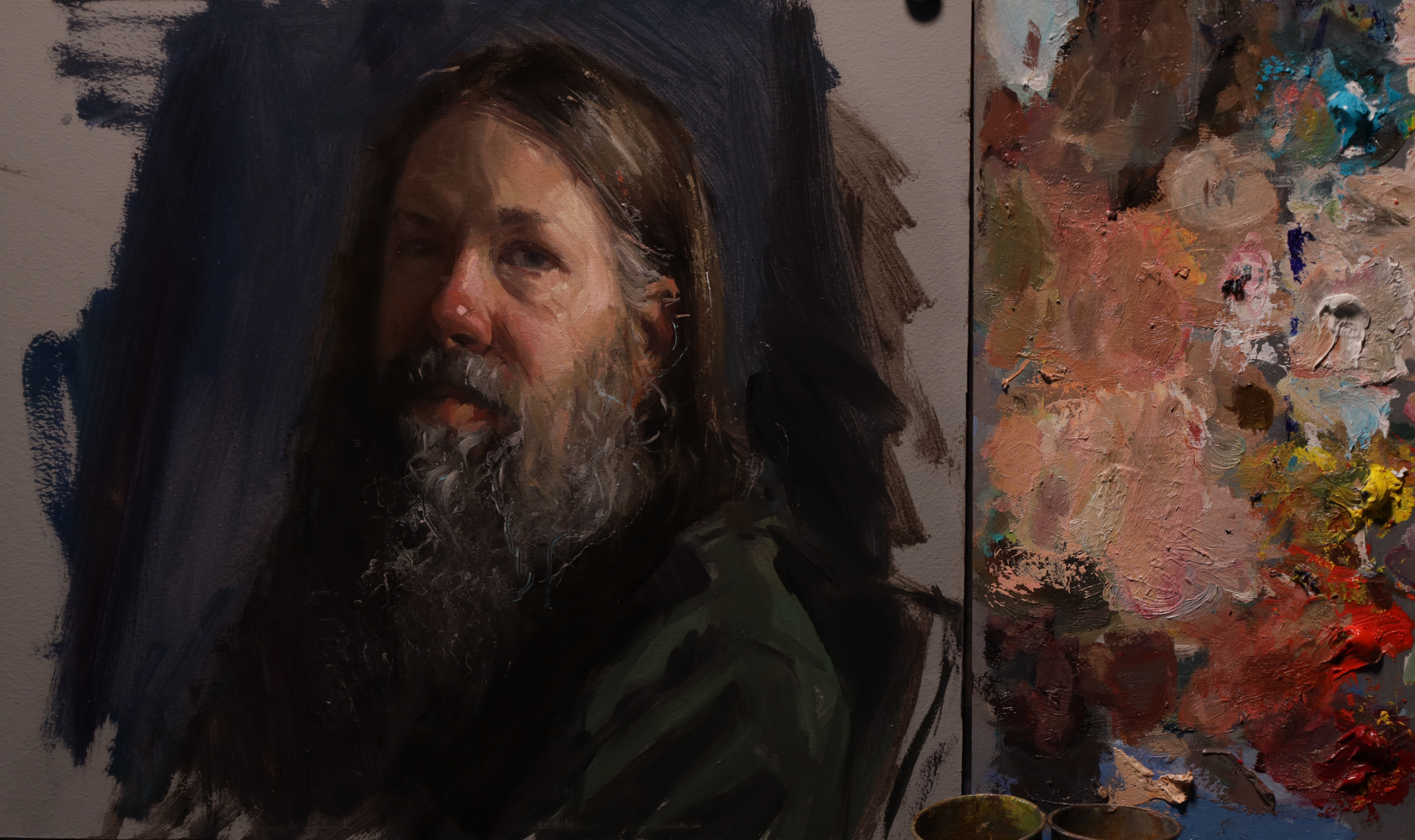We worked on developing the darks, midtones and lights. We added in variations and and tried to refine the painting as we extended the value range into the lights. Same for the beard, bring out the darks and lights. We looked for the pattern of light in the beard and had some fun using a plastic fork to get some of the texture.