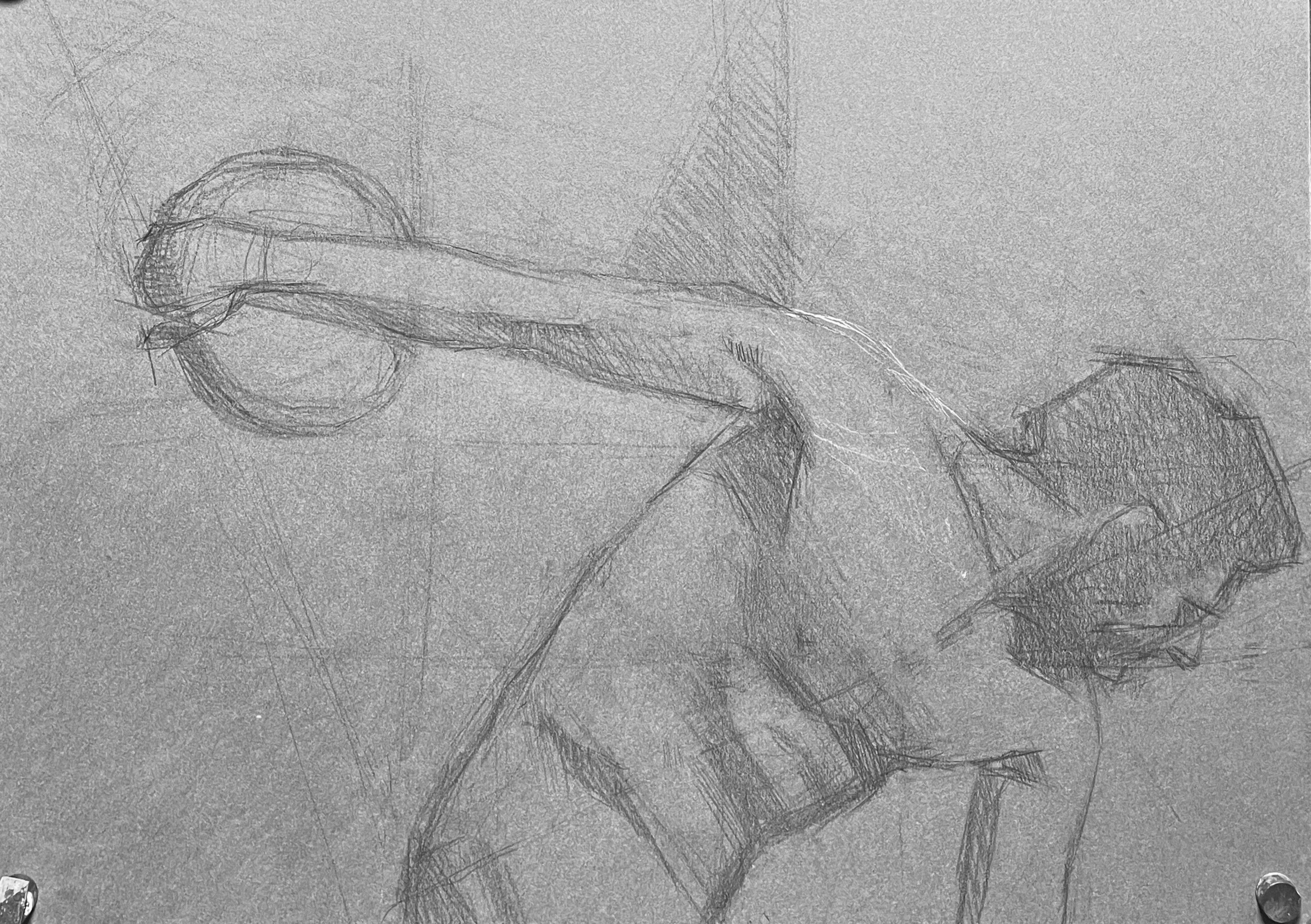 This is the first week of a two week pose. The main goal of the the first session is to work out the gesture and proportions. Then we start into the shading in the shadow shapes. If you still have time at this point. work to refine the big shapes. Next week we will develop the drawing and add all of the variations.