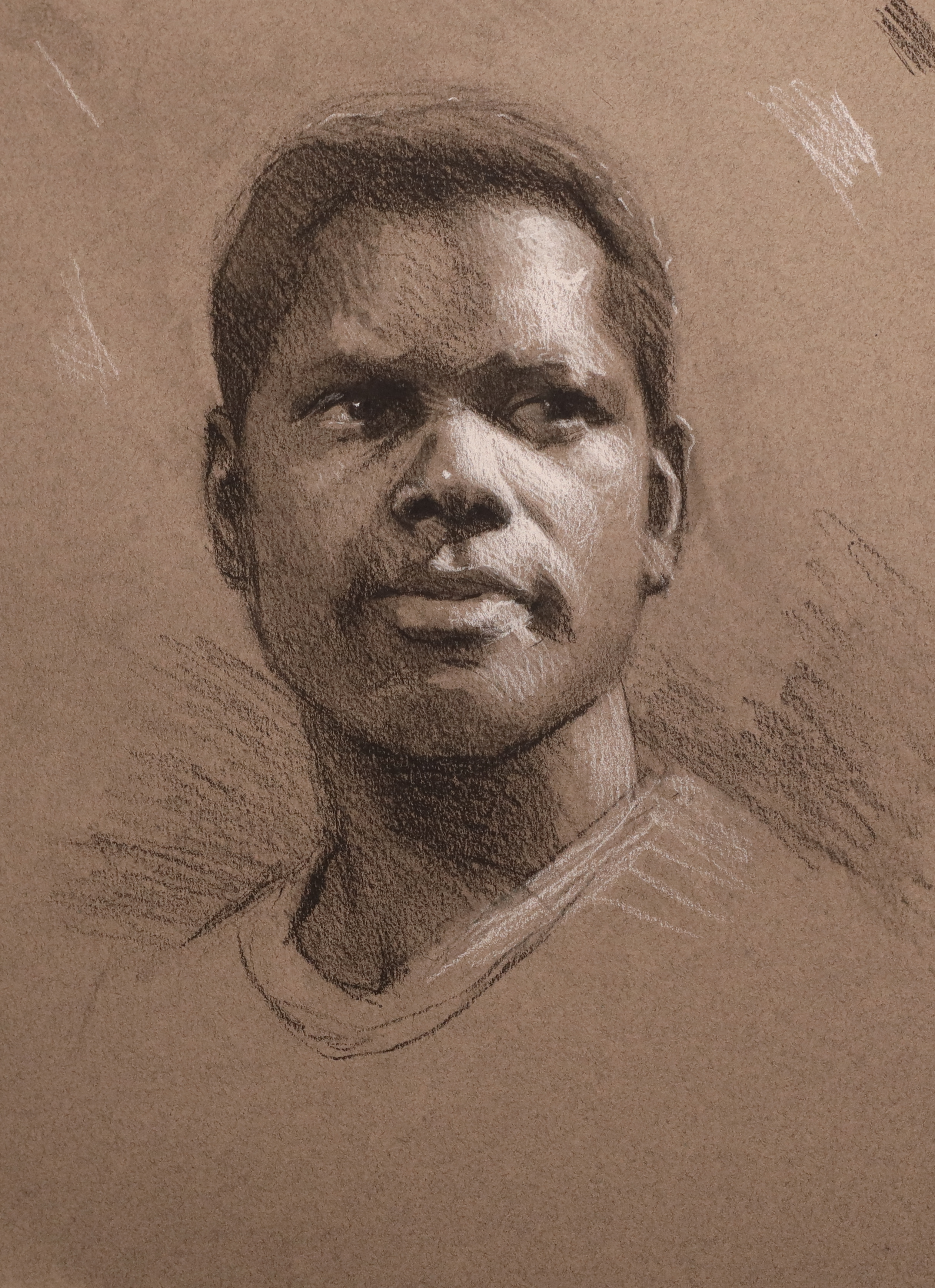 Assignment: This week we continued working on the drawing of Young Sidney Poitier. We refined the proportions as we went into establishing the dark shapes. The aim is to Keep the simplicity while adding the detail. The Use of white chalk should be sparing and act as an accent.