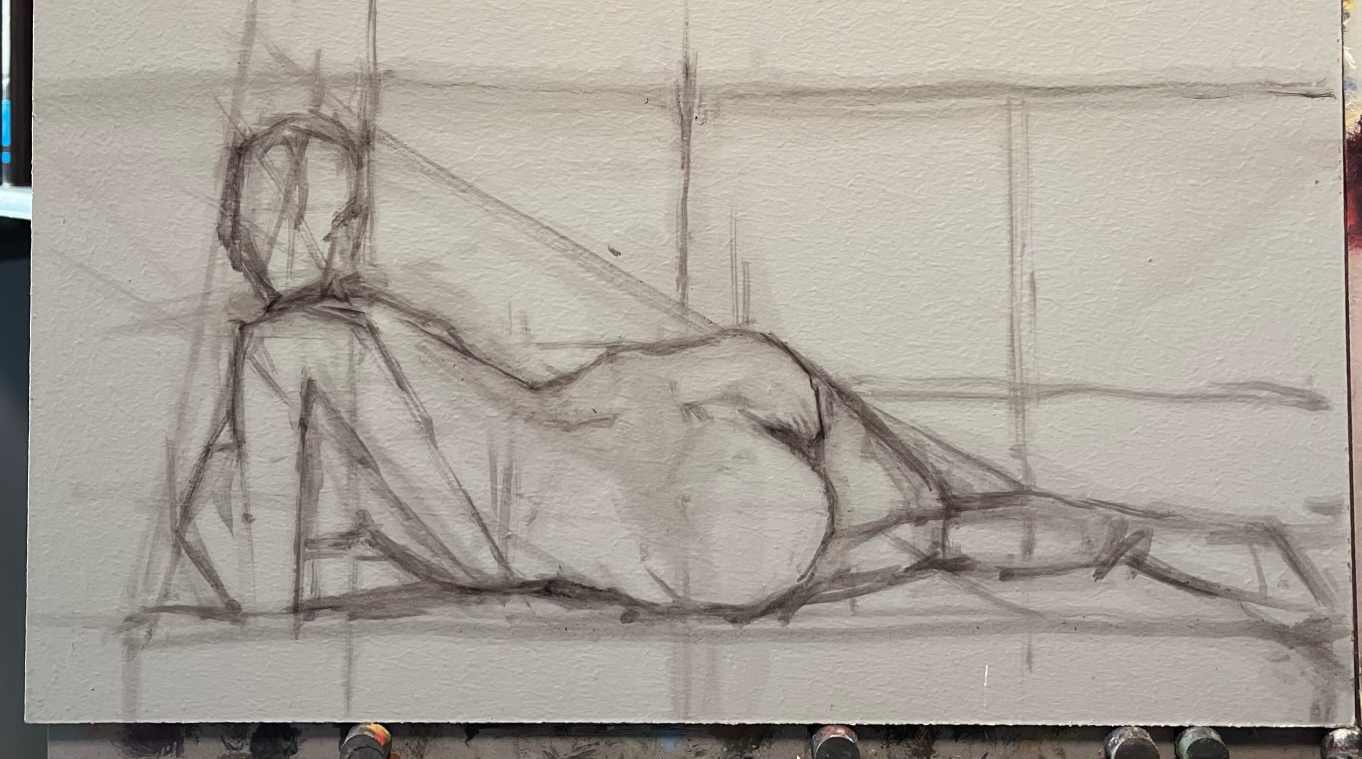 We critiqued in the beginning of the class and looked at the way Uglow pays great care and attention to the color relationships. That said, he pays as much attention to the proportions and linear design in his paintings. Lets follow in the same direction and make the drawing as refined as possible. Remember that it is the big shapes that are most important. Work along with the video to complete your drawing by next week.